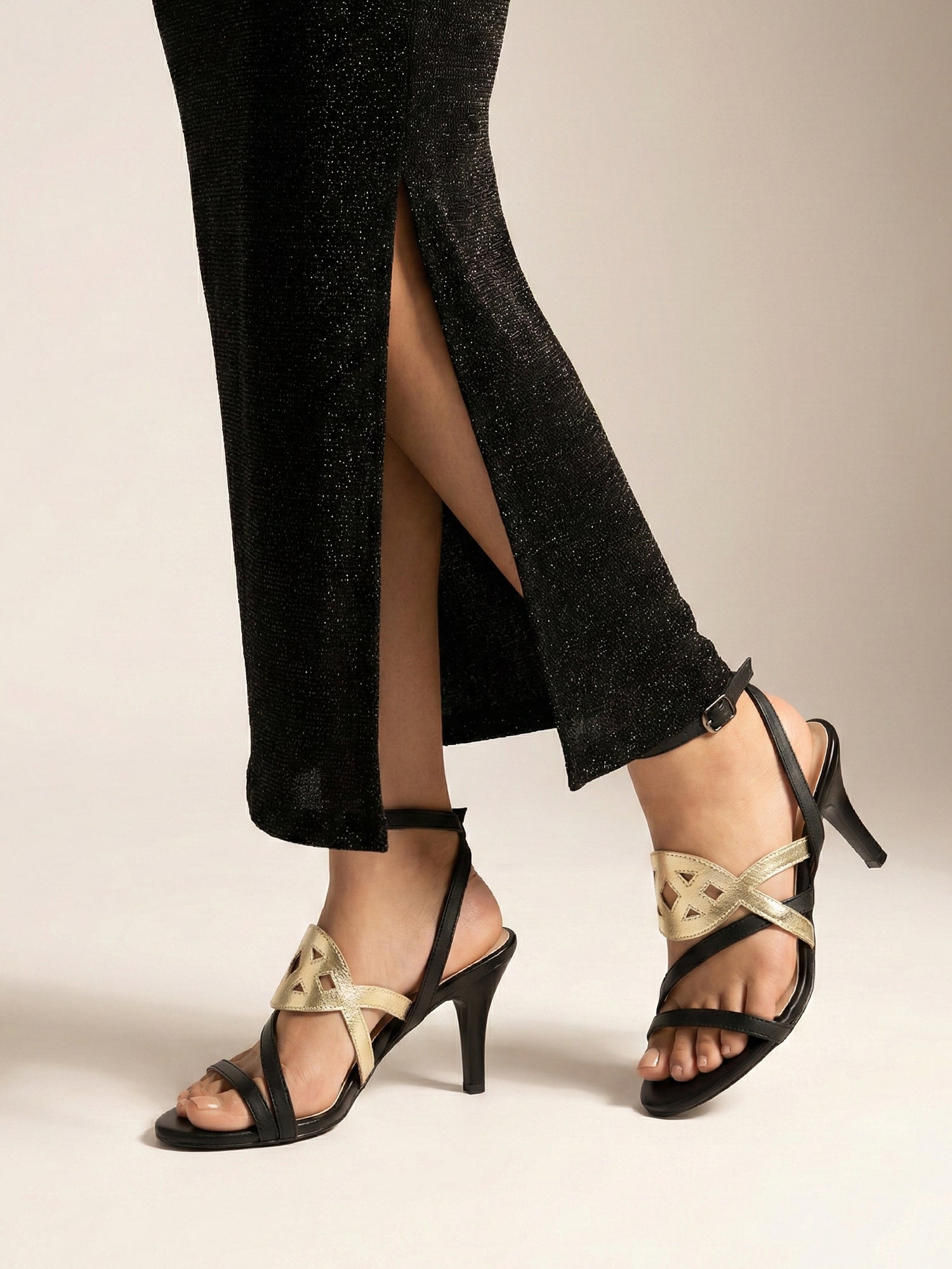 These heels are designed to be the epitome of glamour, perfect for any high-fashion occasion. The pencil heel design offers a sleek and slender profile, elongating your legs and adding a touch of refinement to your outfit. The golden laser-cut detailing is intricately crafted, creating a stunning contrast with the multiple black straps that wrap around your foot for a bold and contemporary look.