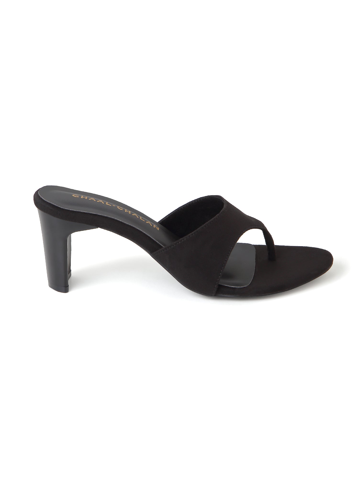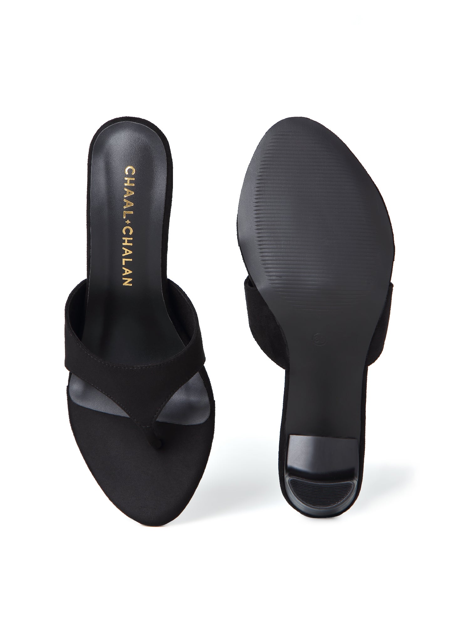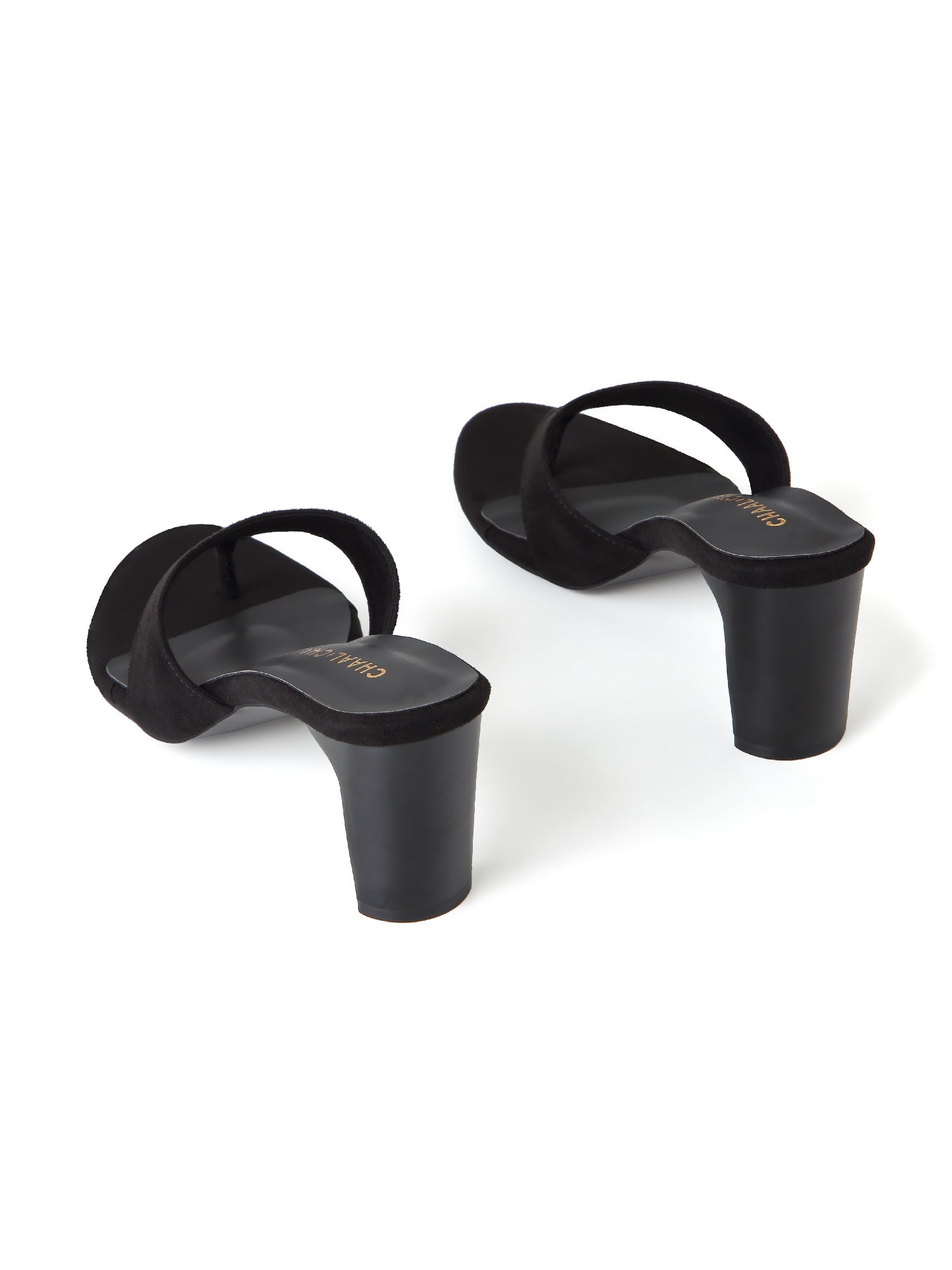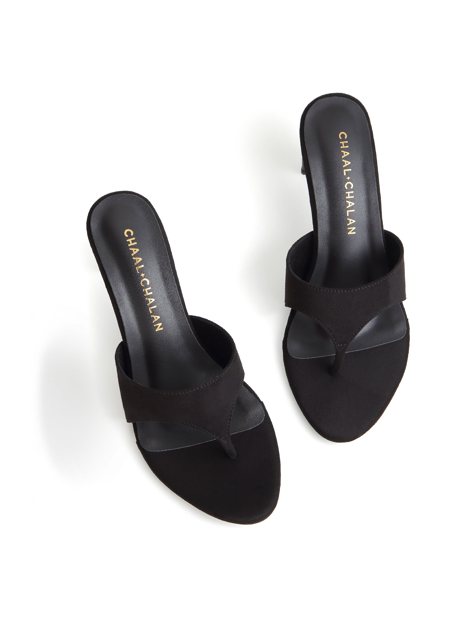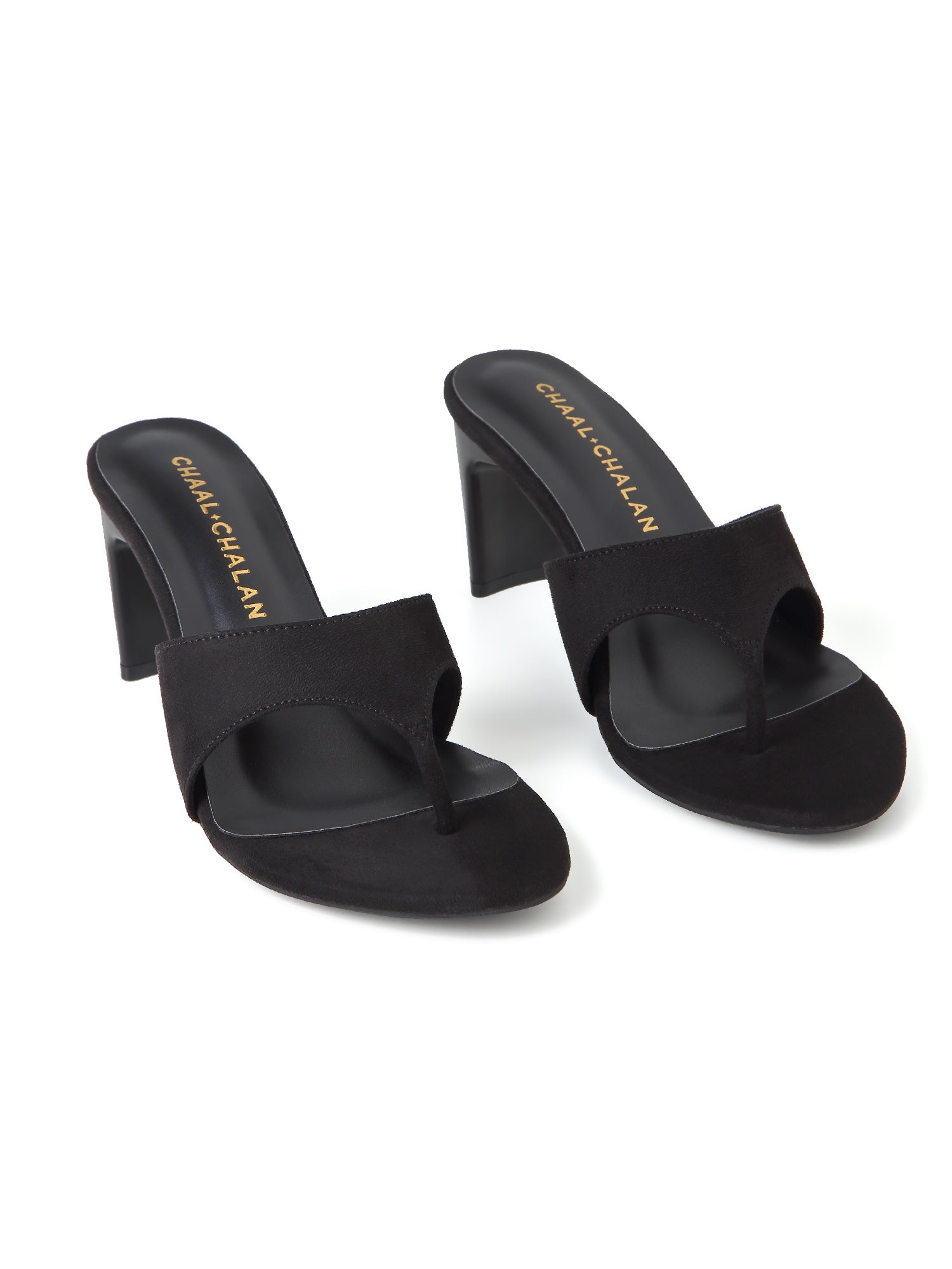 Elevate your look with this minimalist yet polished slide sandal featuring a slender toe-post design and a smooth black velvet upper that transitions into a subtle mid-heel for an elegant silhouette. The open-toe layout and clean lines offer an effortless slip-on experience, while the gently curved heel provides a refined lift without sacrificing comfort.