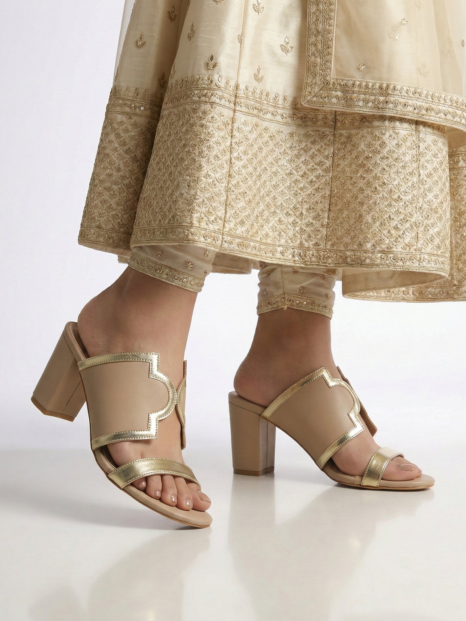 The laser-cut design adds a touch of artistry, creating delicate patterns that exude style and breathability. Complementing this exquisite craftsmanship is the subtle gold border that adds a hint of glam, making these heels perfect for both daytime chic and evening glamour. Whether you're attending a wedding, a festive celebration, or simply elevating your daily look, these beige laser-cut block heels strike the perfect balance between style and functionality.