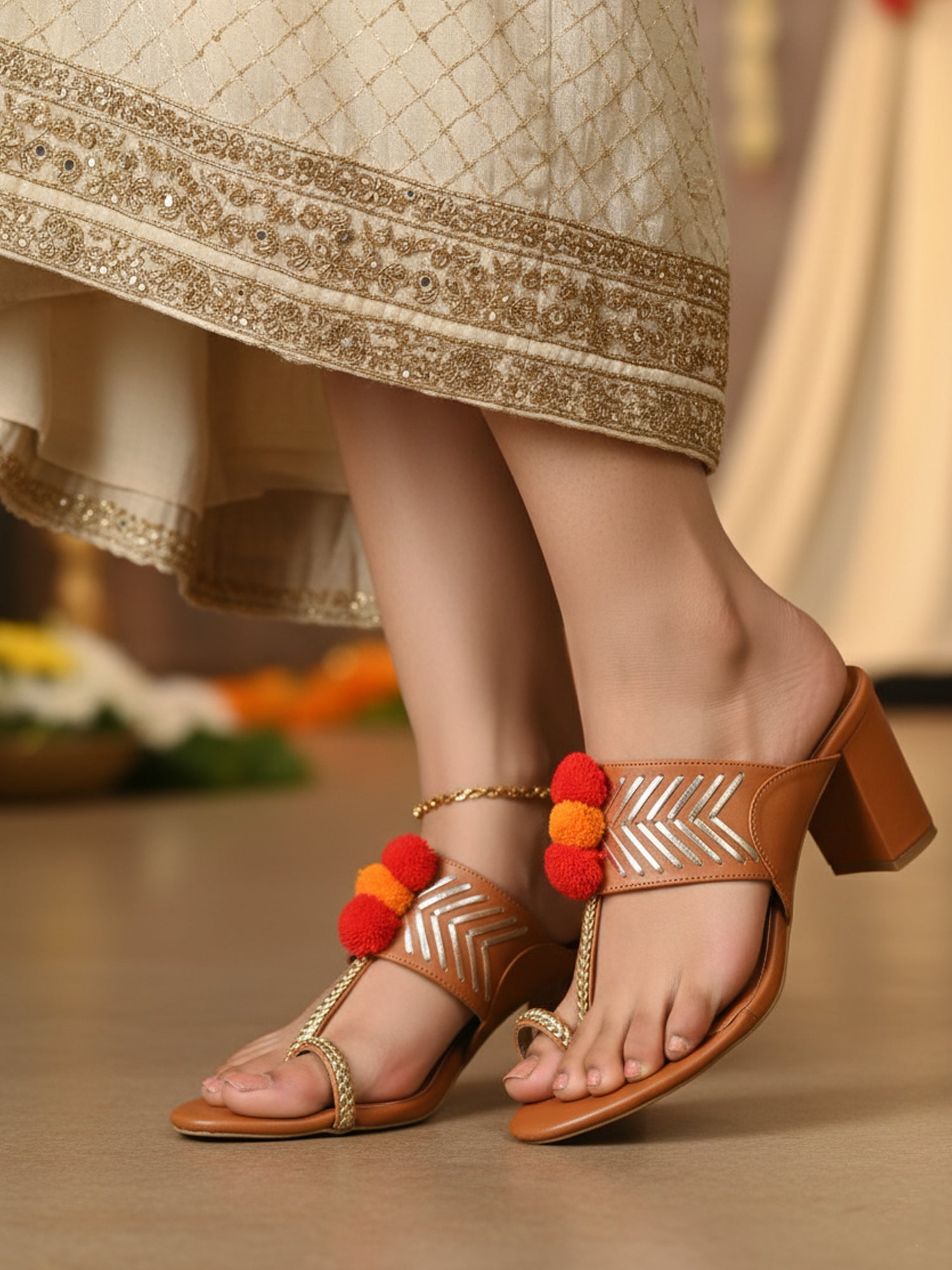 A stunning blend of traditional charm and playful modern details. These heels are designed to stand out, featuring the classic Kolhapuri silhouette paired with a comfortable block heel for added height and support. Adding a fun, vibrant touch are colorful cotton balls that decorate the straps, creating a lively, eye-catching contrast against the silver detailing. This playful accent makes them perfect for festive occasions.