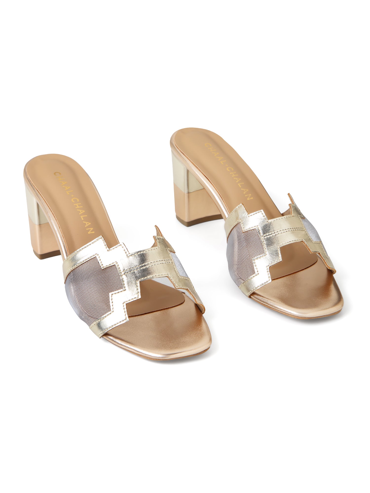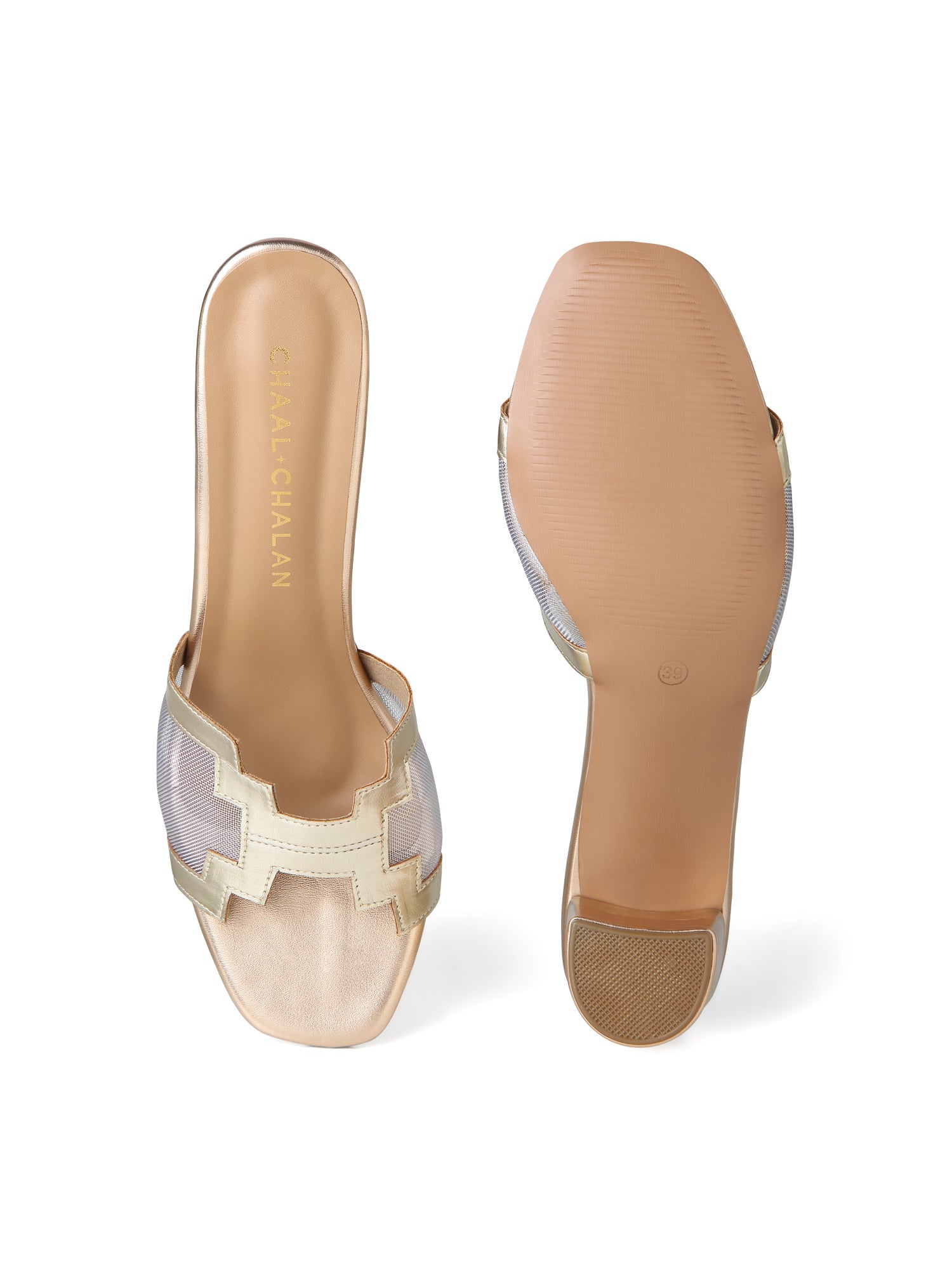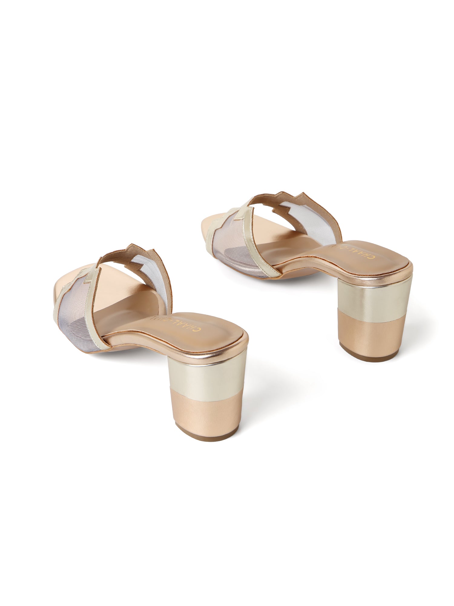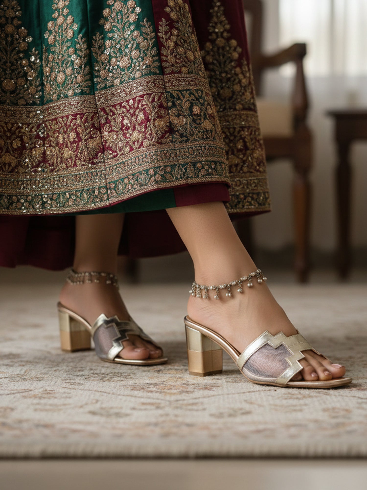 Step into effortless elegance with these stylish dual-tone heeled sandals, beautifully finished in a luxurious blend of gold and silver shades. Designed with a sleek open-toe silhouette and a comfortable mid-height heel, these sandals offer the perfect balance of glamour and wearability. The metallic upper adds a modern, eye-catching appeal, while the smooth cushioned insole ensures all-day comfort. The sturdy heel provides stable support, making them ideal for parties, weddings, festive occasions, or evening outings. Pair them with ethnic wear, dresses, or contemporary outfits for a refined and sophisticated look.