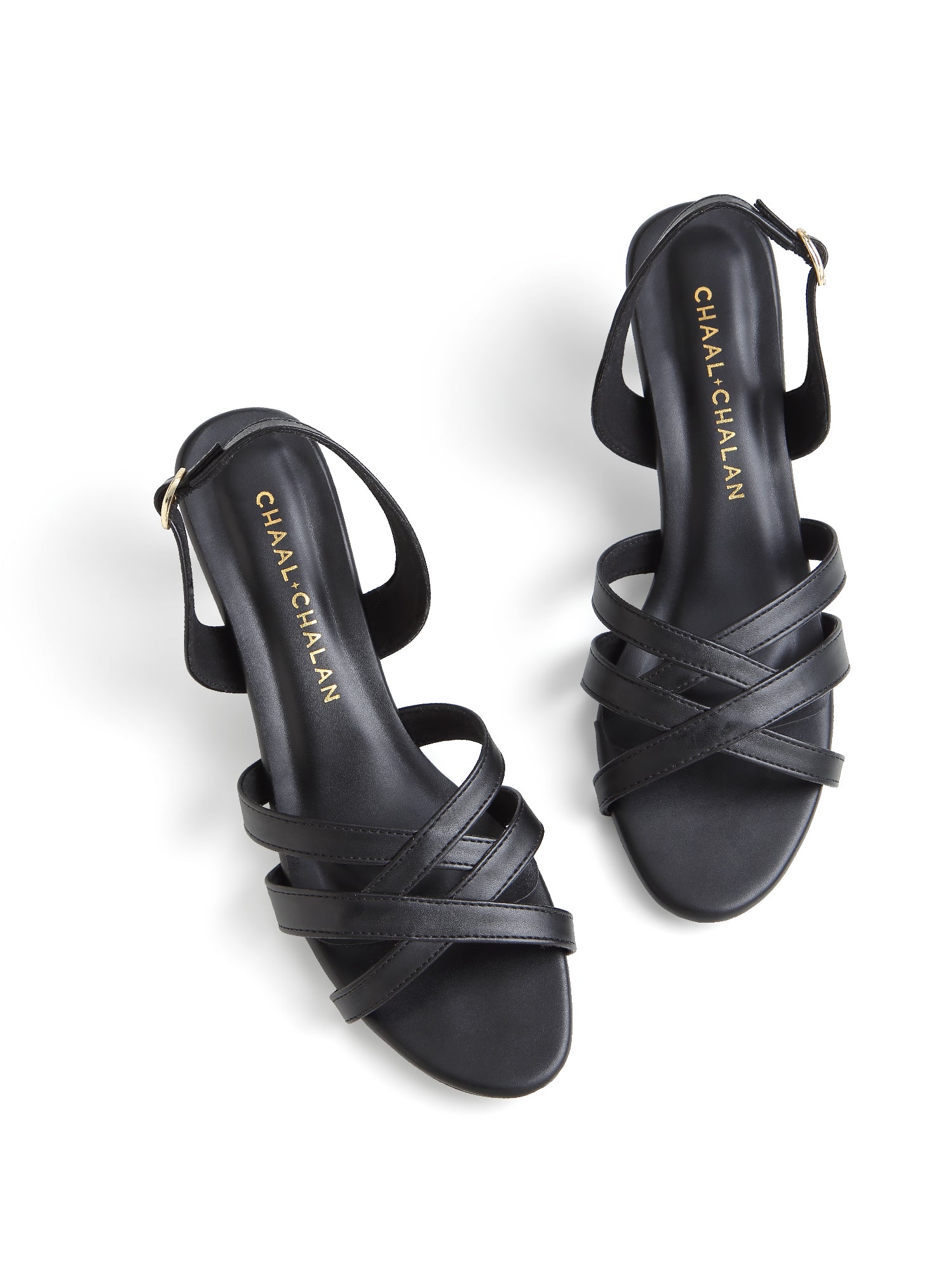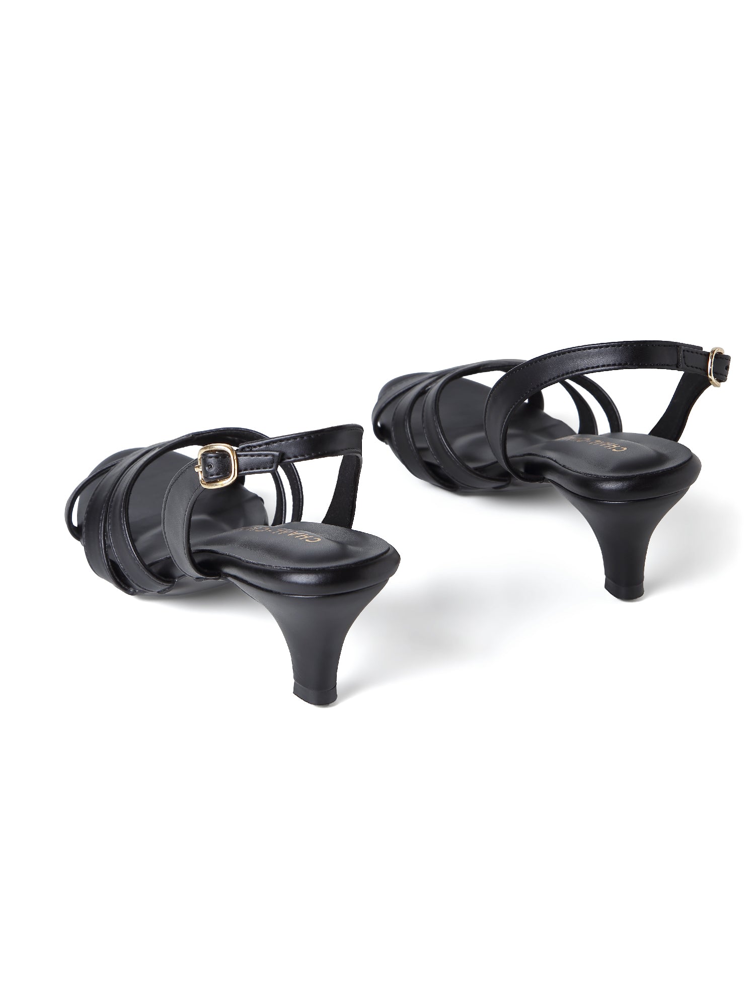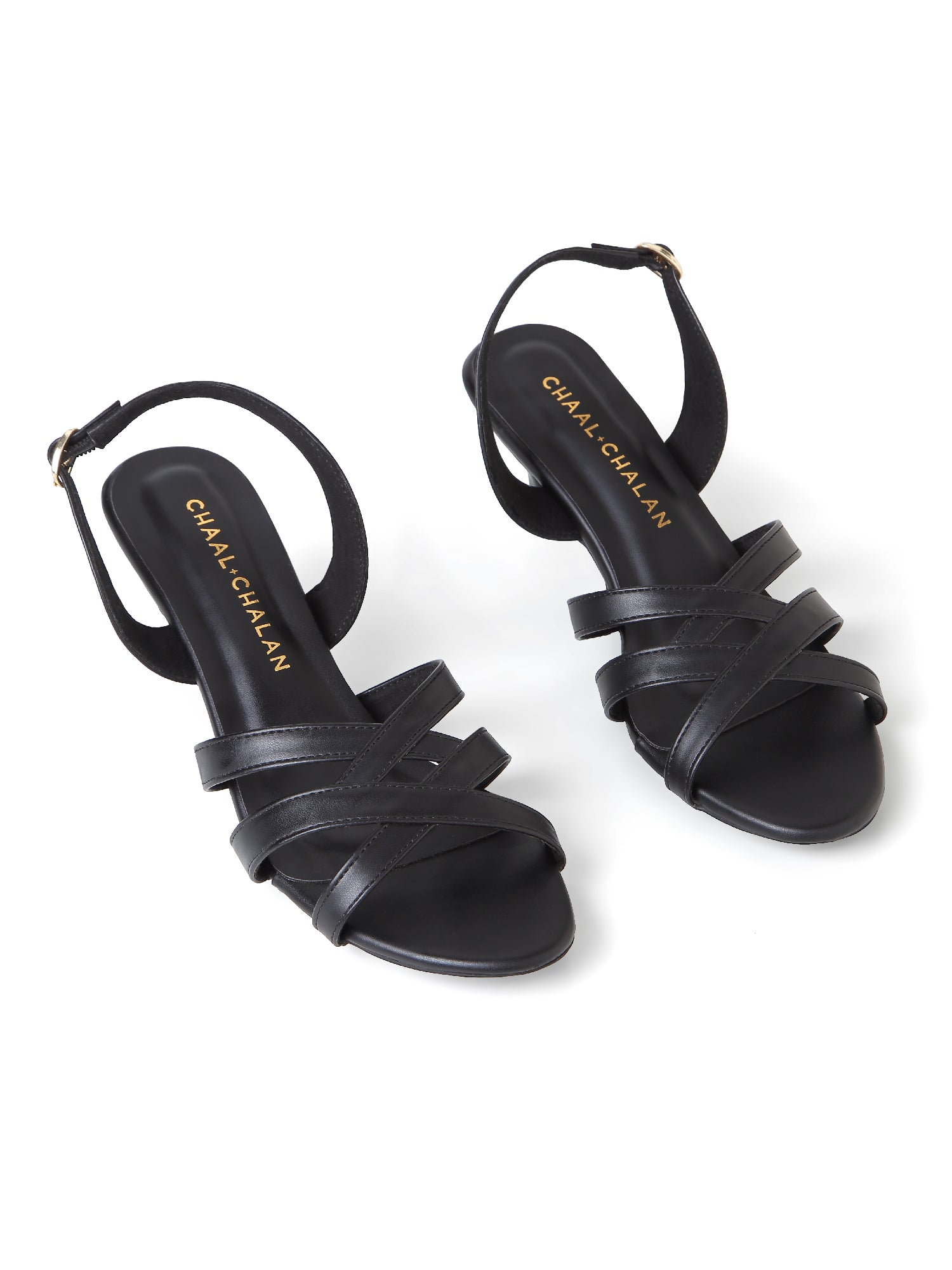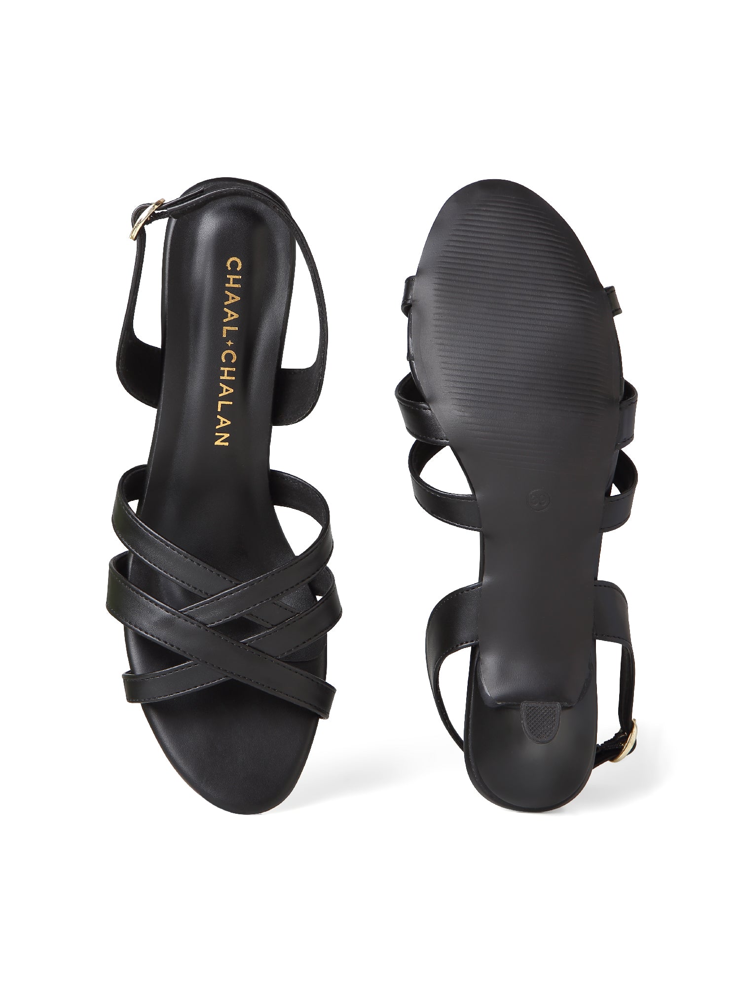 This elegant women’s sandal features a black finish with sleek, crisscross front straps that provide both style and comfort. Designed with a slim mid-height heel, it offers a refined look perfect for parties, formal events, or casual outings. The adjustable ankle strap with a small buckle ensures a secure and customizable fit. Crafted for both style and ease, this sandal adds a touch of sophistication to any outfit.
