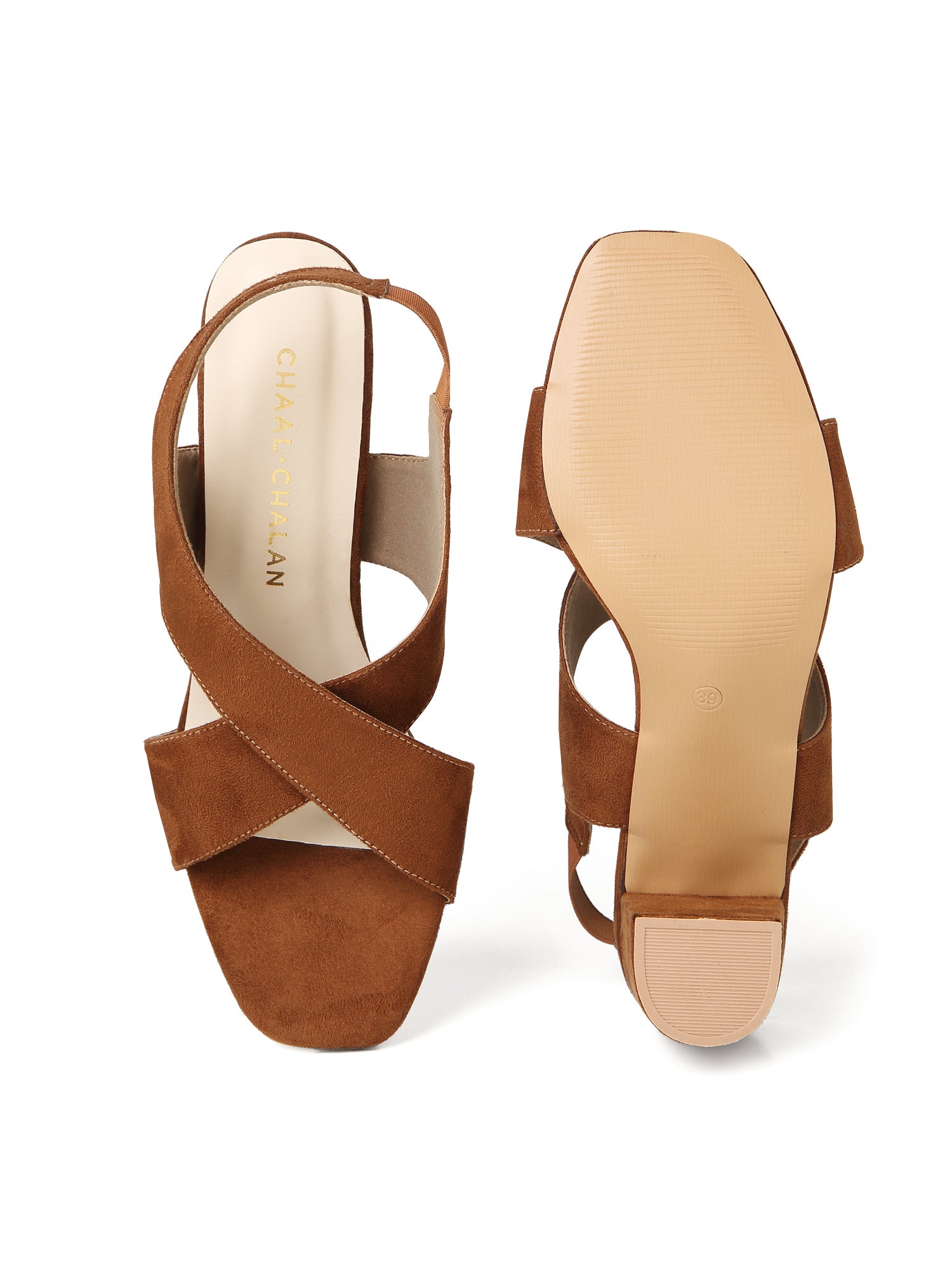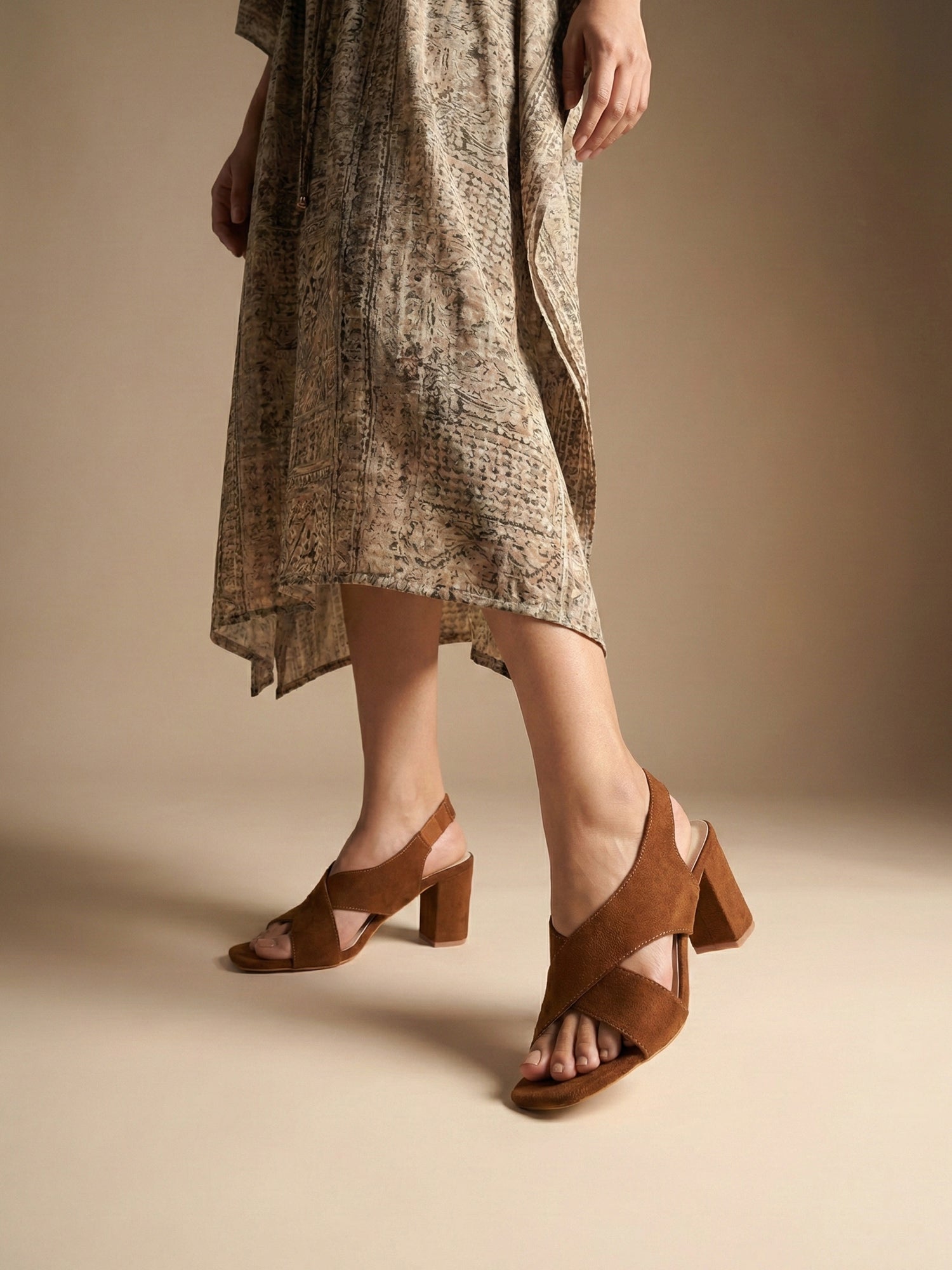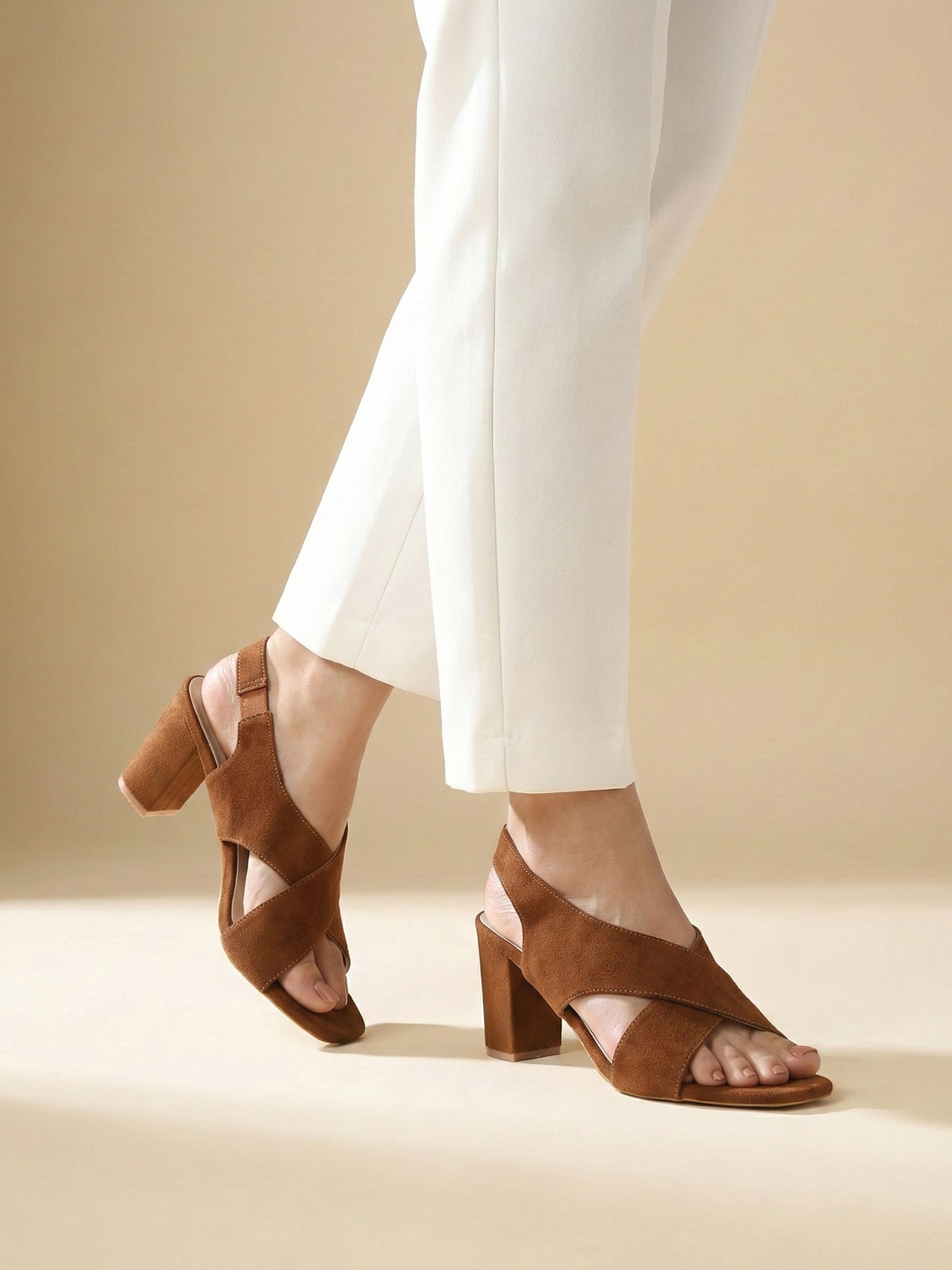 Step into timeless elegance with these chic brown suede sandals featuring a stylish cross-strap design and comfortable block heels. Perfect for both casual outings and semi-formal occasions, these sandals combine modern fashion with unmatched comfort. Crafted from soft, high-quality suede material, the cross-style straps provide a secure fit while adding a touch of texture and luxury. The earthy brown hue complements a variety of outfits, making these sandals a versatile staple for any wardrobe.