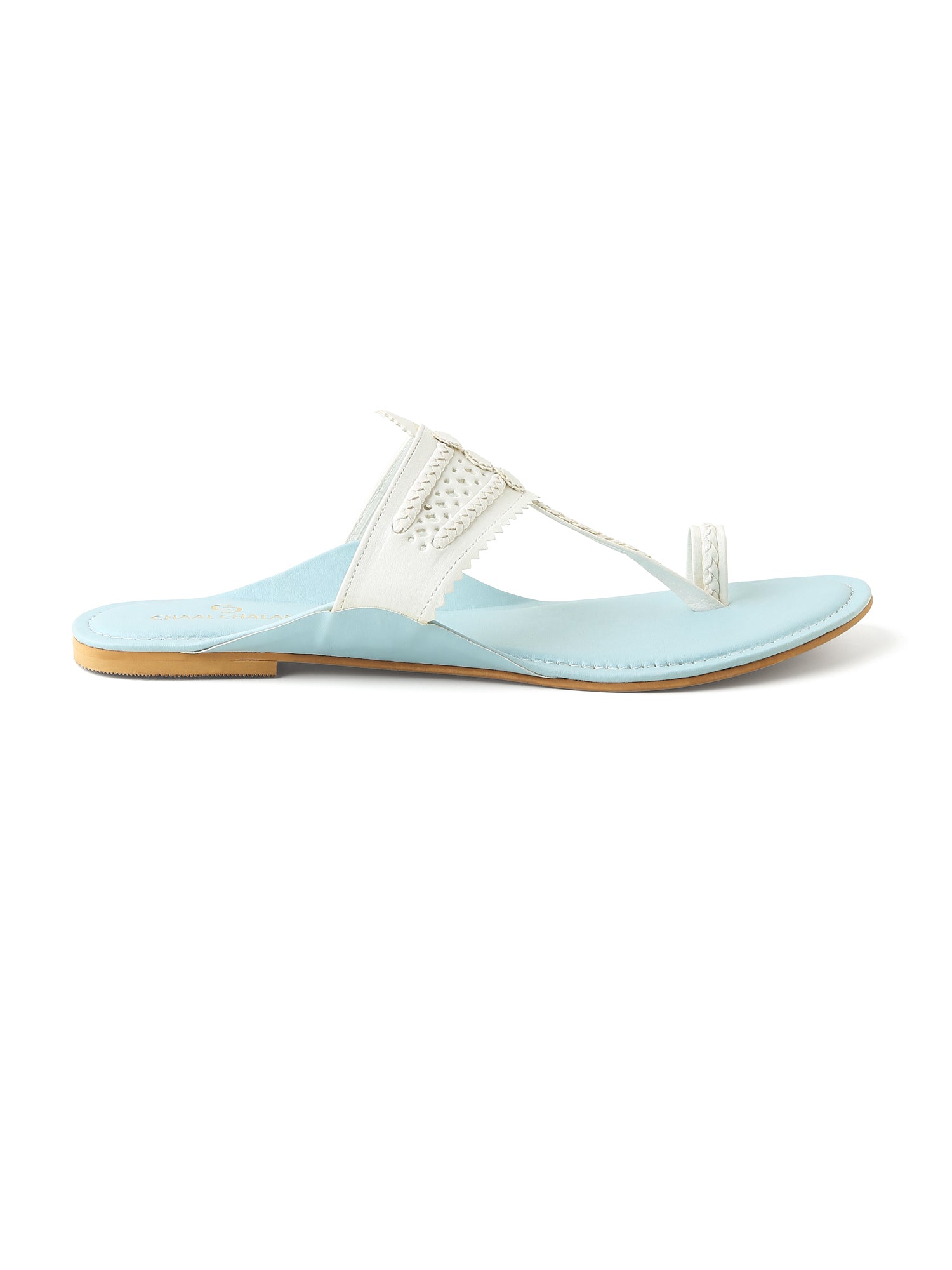 Chaal Chalan Introducing our Blue and White Kolhapuri Flats, a delightful fusion of tradition and modern style. These flats seamlessly blend the timeless charm of Kolhapuri design with a fresh color palette, creating a footwear masterpiece that's both classic and contemporary.