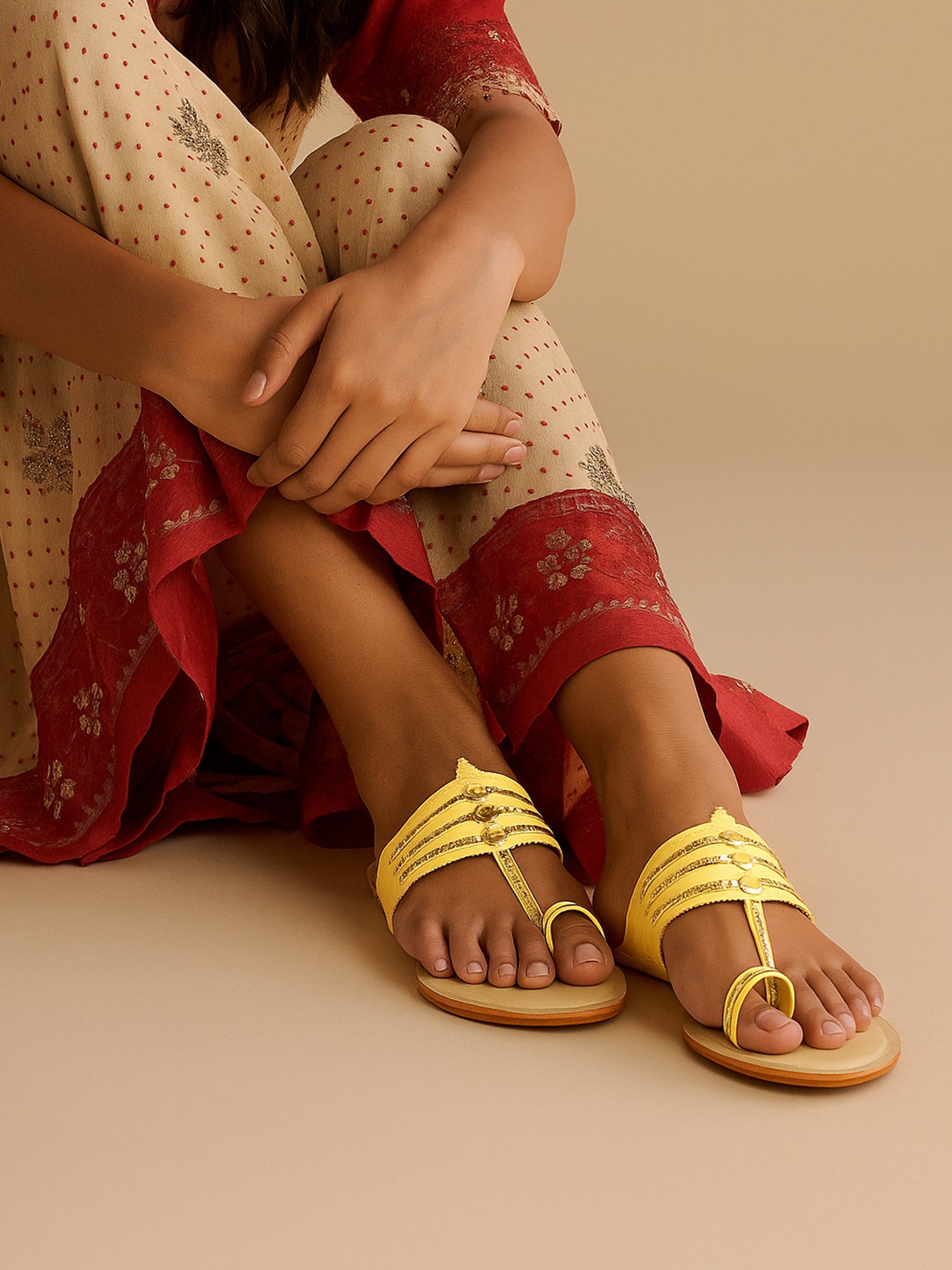 Chaal Chalan Introducing our Yellow and Beige Kolhapuri Flats, a harmonious blend of traditional charm and vibrant modernity. The combination of yellow and beige adds a sunny and versatile touch to the classic Kolhapuri silhouette. The intricate detailing on the straps reflects the craftsmanship associated with Kolhapuri footwear, while the vibrant color scheme brings a modern twist, making these flats suitable for various occasions.