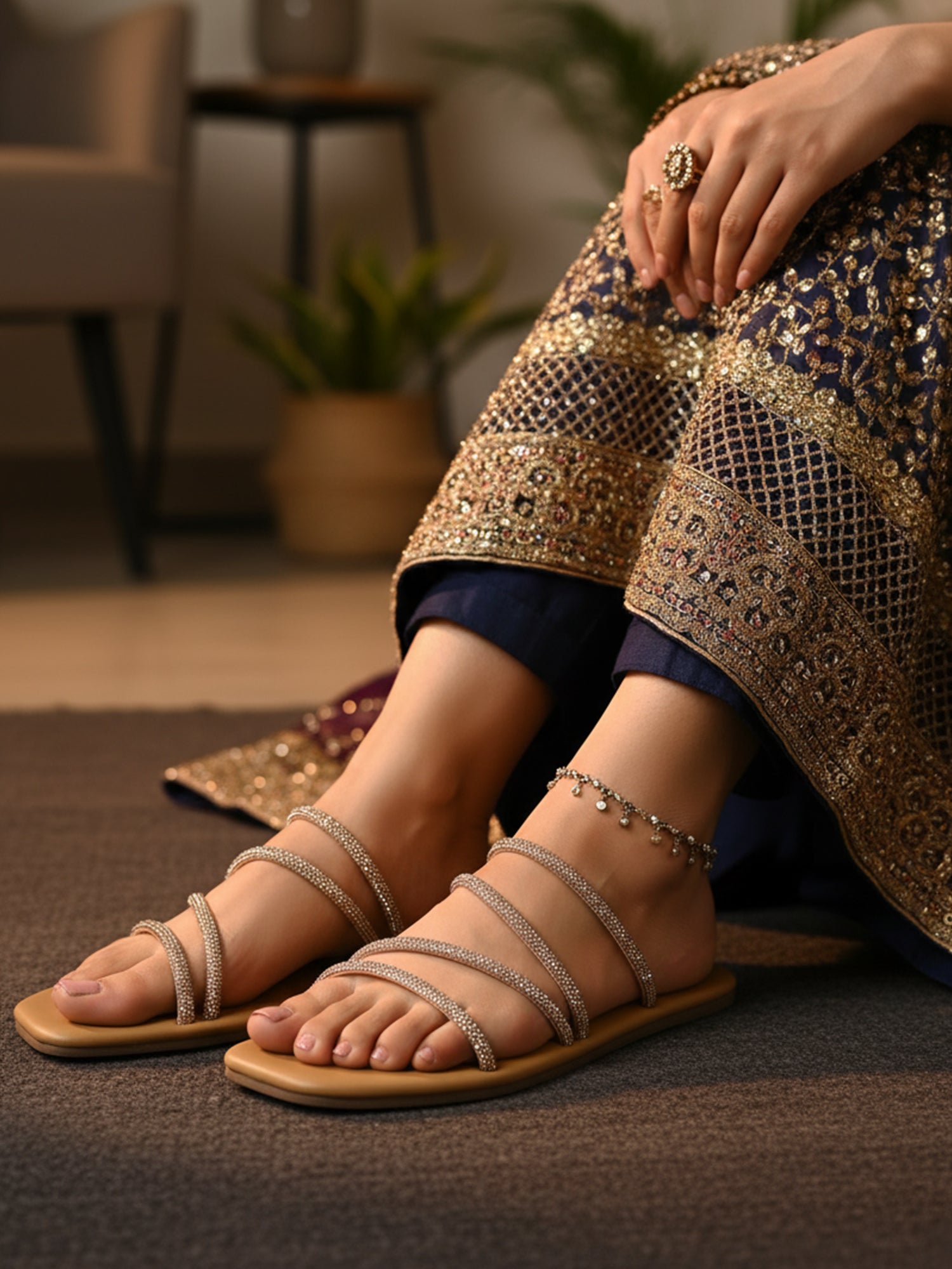 These elegant sandals feature multiple delicate straps embellished with sparkling rhinestones, adding a touch of glamour to any outfit. Designed for effortless style, they come in an easy slip-on design, making them perfect for both casual and formal occasions.