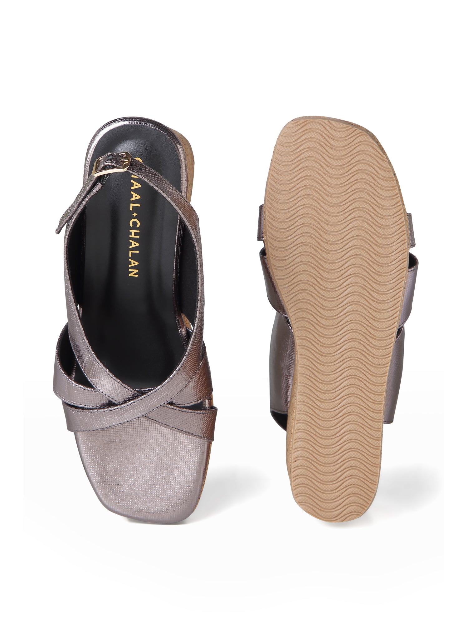 This stylish wedge sandal features a shimmering metallic silver upper with crisscross straps that provide both elegance and support. The open-toe design offers a comfortable fit, while the natural cork wedge heel adds height without sacrificing stability. Subtle sparkle flecks in the cork give it a touch of glam, making it suitable for both casual outings and dressier occasions.