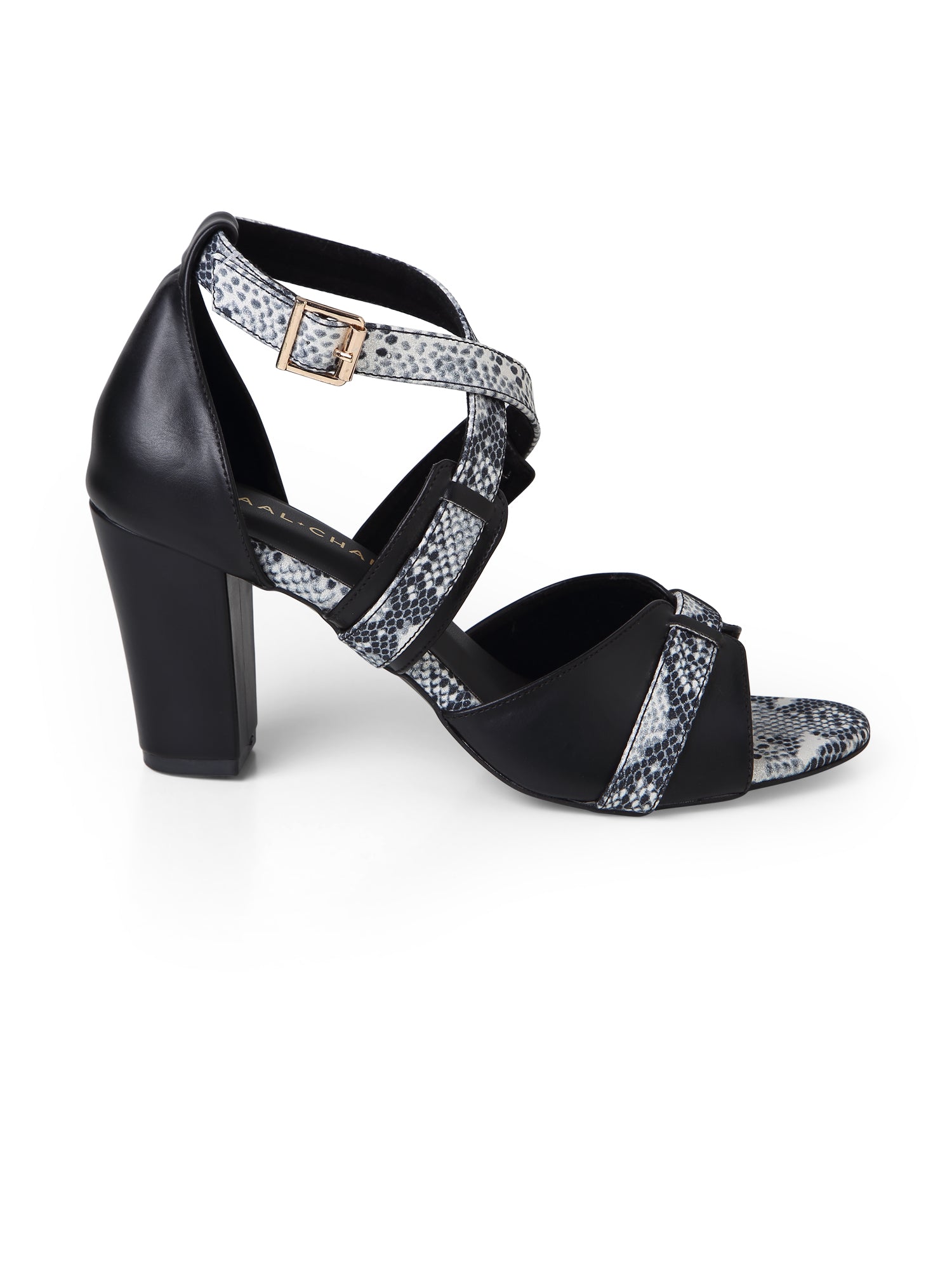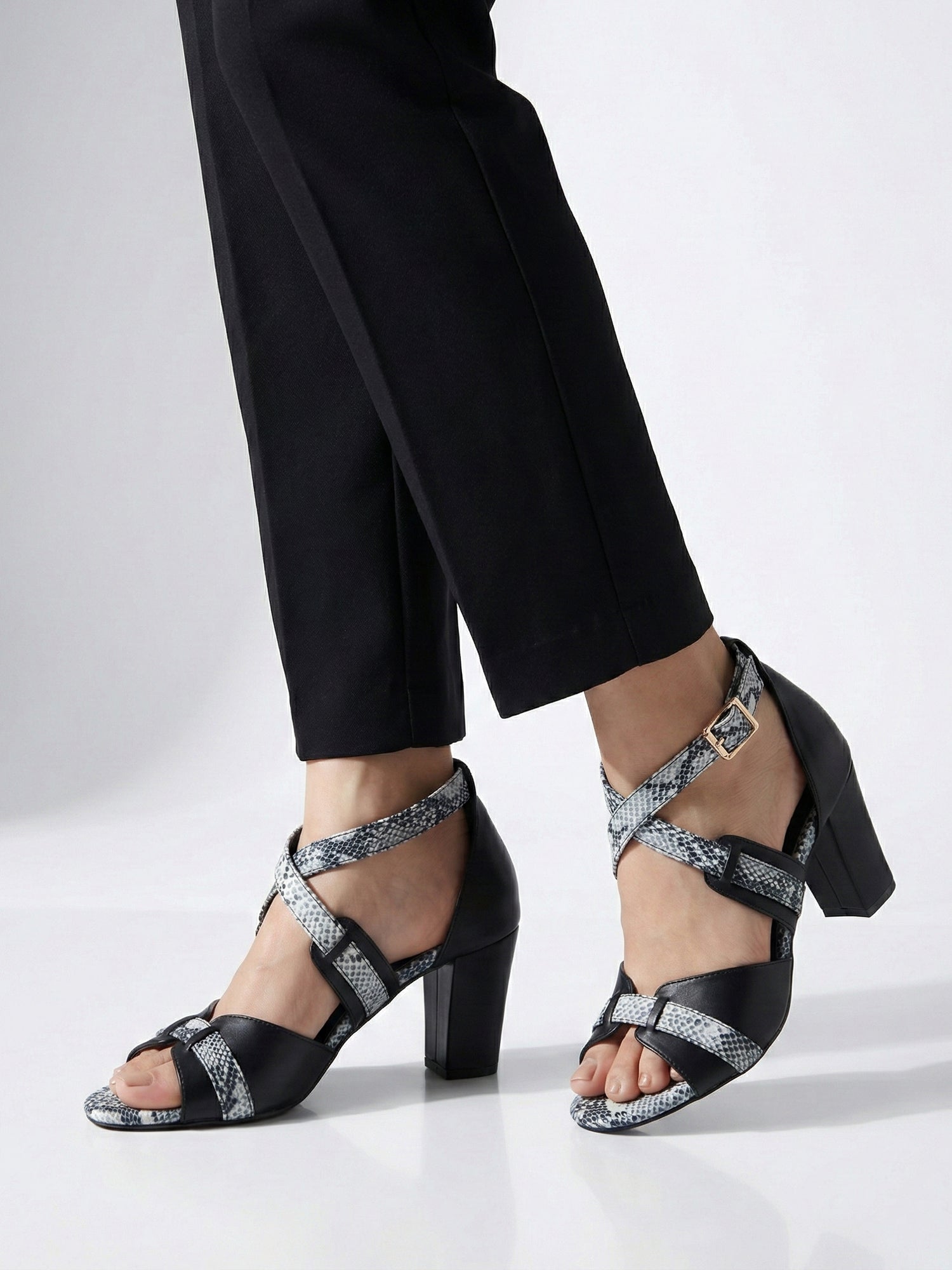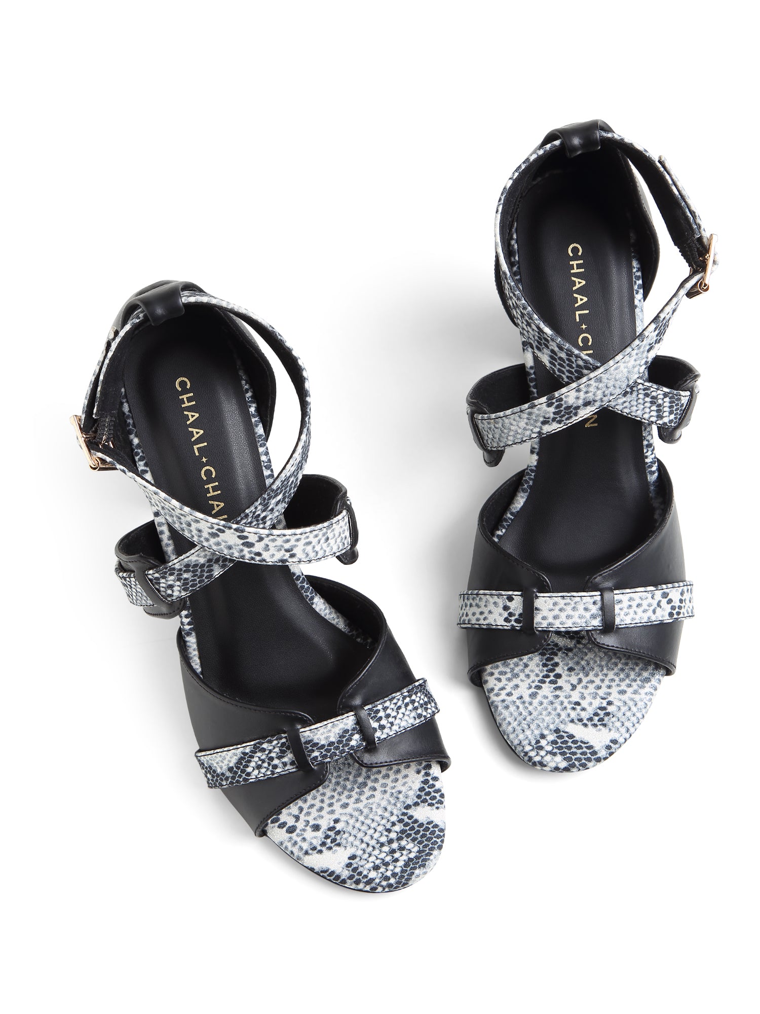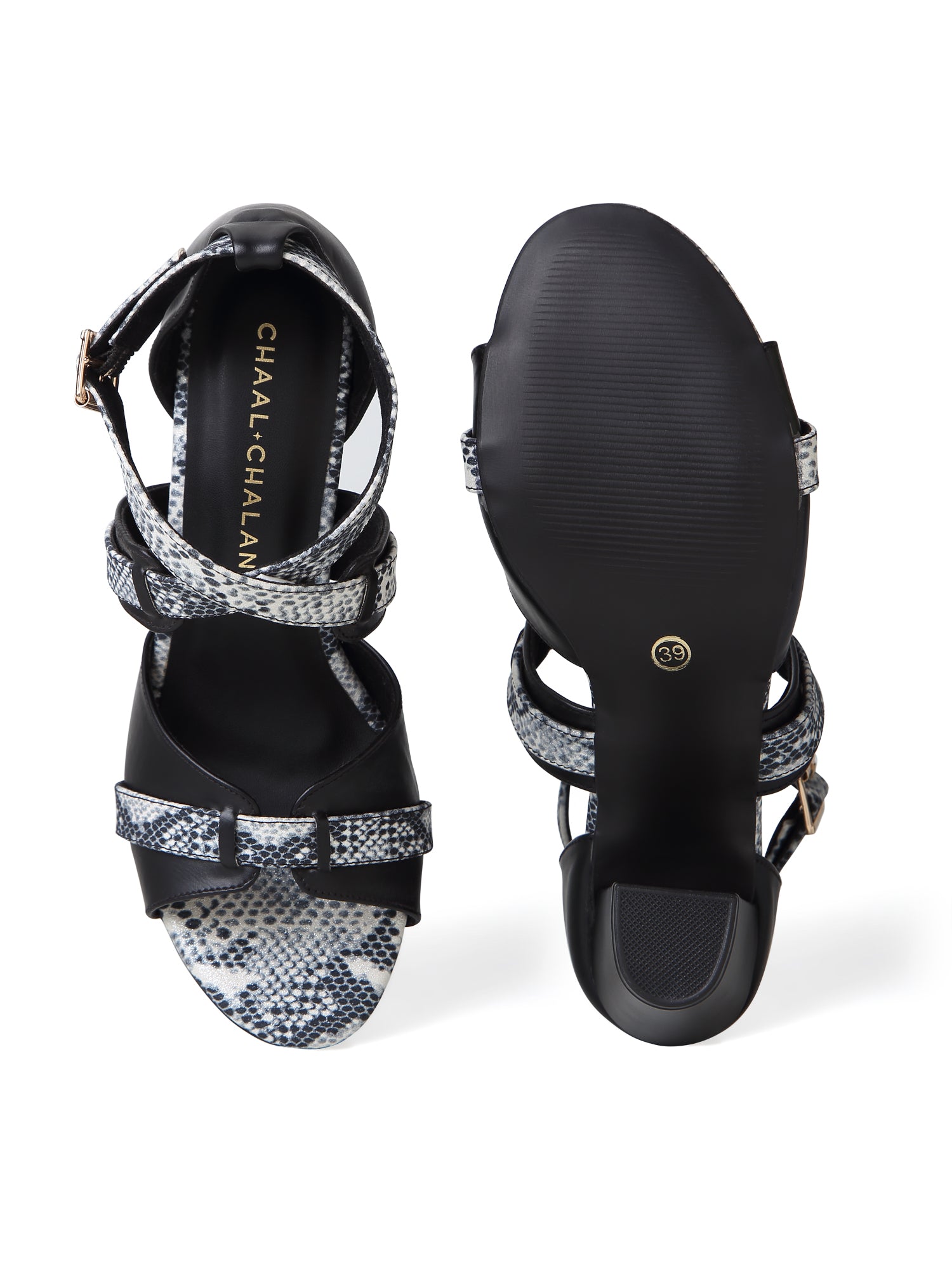 A stylish high-heeled sandal featuring a sleek black upper with contrasting tones of grey-and-white snakeskin-patterned straps. The design includes an open toe, supportive ankle strap, and a sturdy block heel, combining elegance with a modern, bold touch.