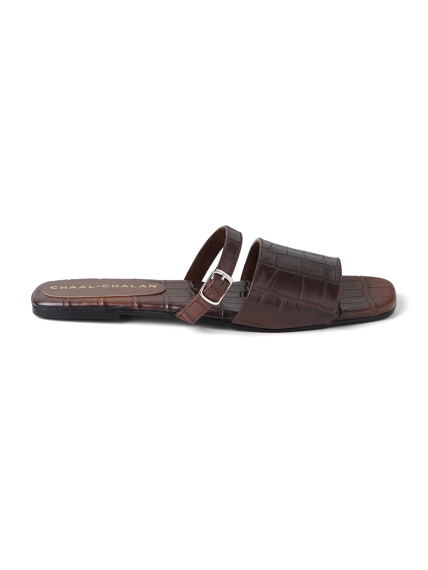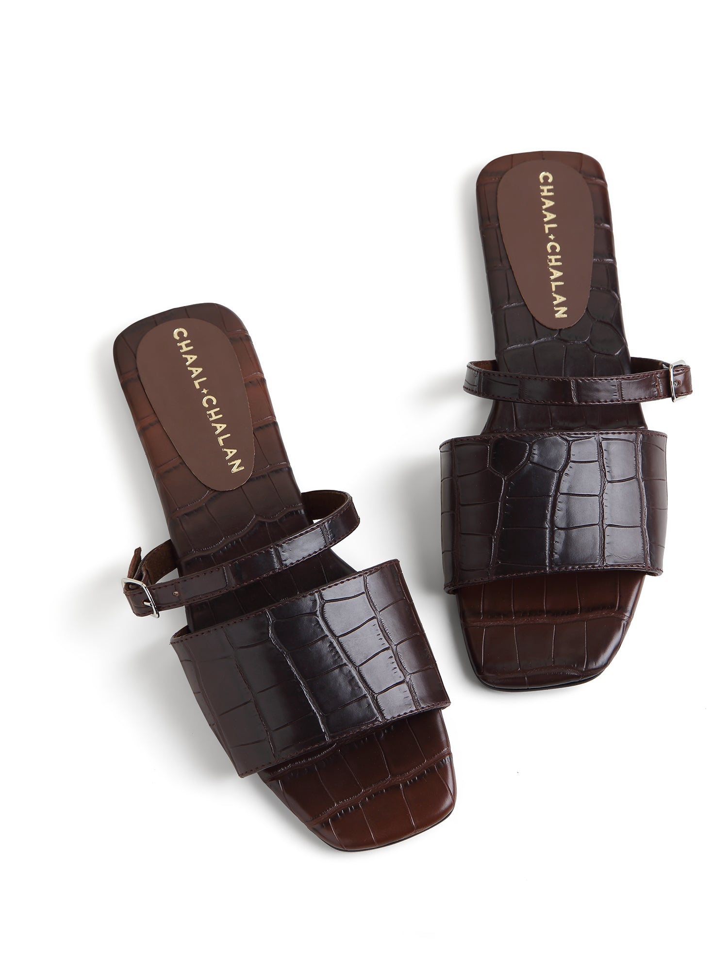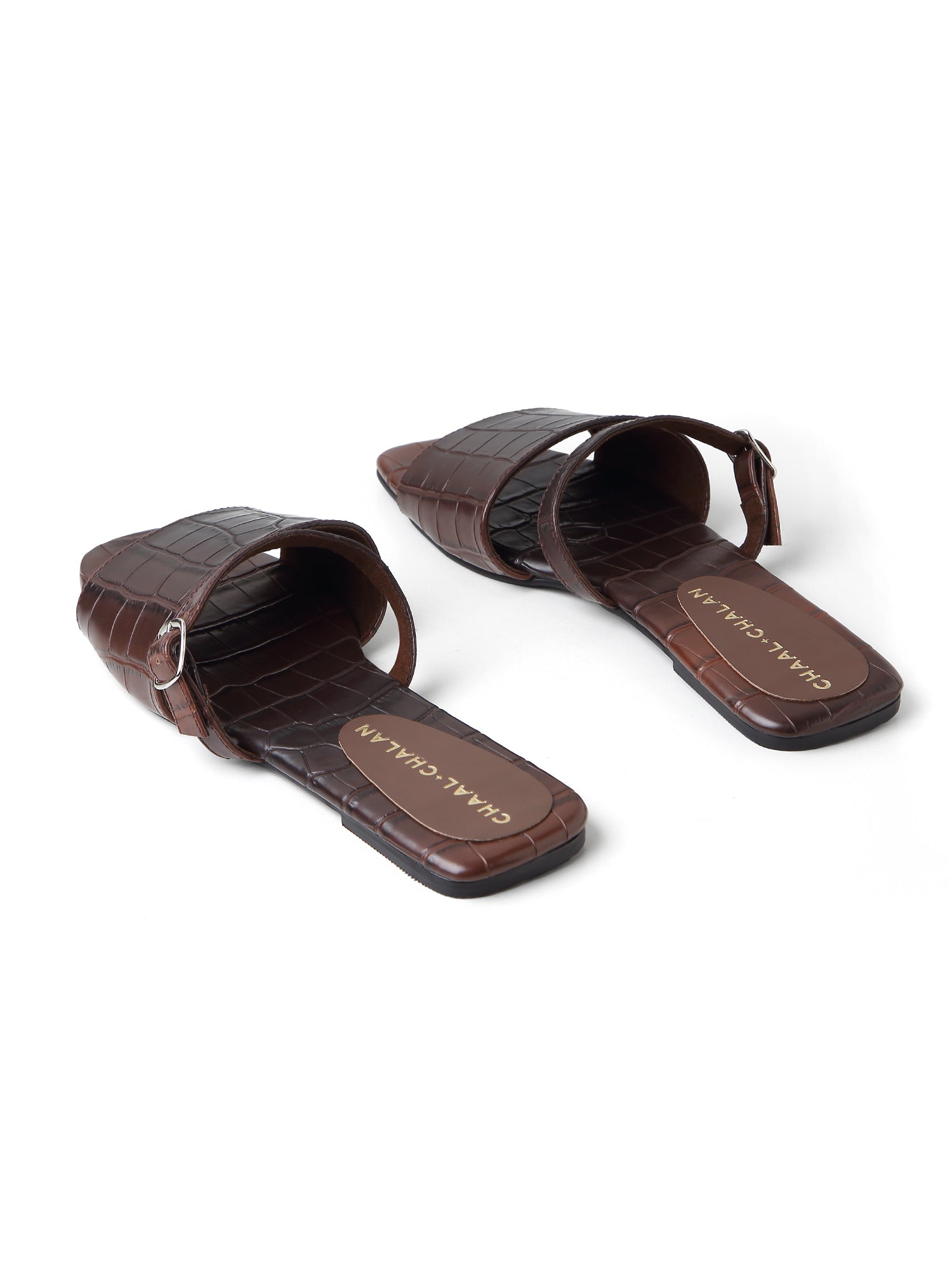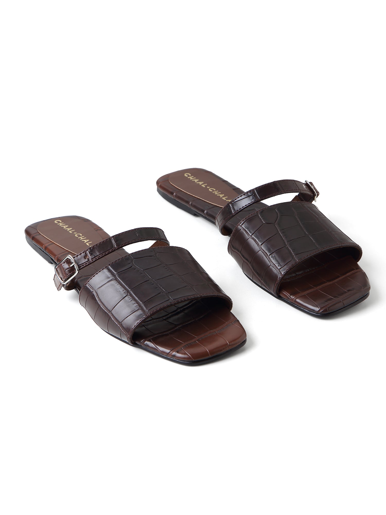Elevate your everyday style with these brown croc-textured flats from Chaal Chalan. Featuring a wide textured strap and a sleek side buckle detail, these sandals combine a bold look with comfort. The square-toe design adds a contemporary edge, while the cushioned footbed ensures ease with every step. Perfect for casual outings, office wear, or pairing with ethnic ensembles, these versatile flats are a wardrobe must-have.